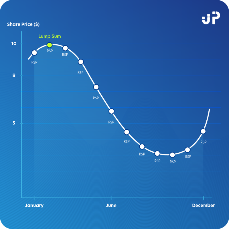 If you invest a lump sum of $1200 during a bull market, you might buy shares at a peak price of $10 each. However, using a monthly $100 Regular Savings Plan (RSP) allows you to invest at different price points, especially when the share price drops. This dollar-cost averaging strategy can result in a lower average share price over the course of a year compared to a lump sum investment.